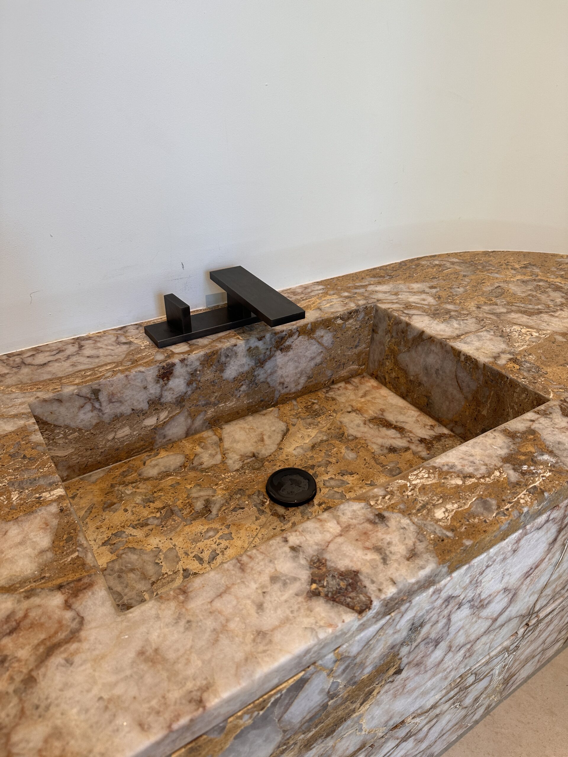 We offer a wide selection of premium natural stone, including marble, granite, quartzite, limestone, travertine, and onyx. We also carry engineered quartz for those who prefer a more uniform look. Visit our Services page to learn more about each material, or stop by our showroom to see and feel the slabs in person.